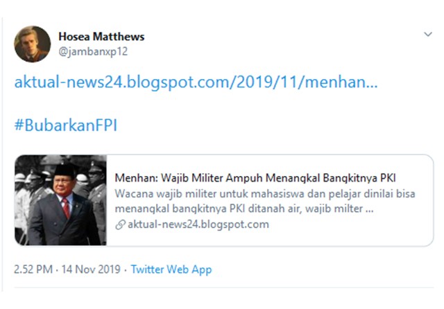Berita blog aktual-news24 tentang wajib militer berasal dari portal berita medcom.id. Namun, isinya sudah diubah. Isu radikalisme diganti menjadi PKI. Narasumber aslinya yang analis intelijen diganti menjadi Menhan Prabowo.