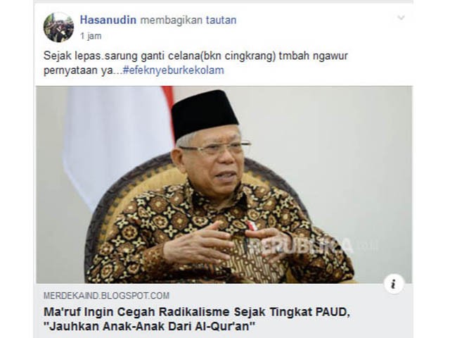 Jawa Pos menemukan bahwa link berita palsu itu diunggah pemilik akun Facebook Hassanudin (bit.ly/JauhkanAlquran). Akun tersebut juga berkomentar nyinyir. ’’Sejak lepas sarung ganti celana (bkn cingkrang) tmbah ngawur pernyataan ya. #efeknyeburkekolam,” tulisnya pada 20 November 2019.