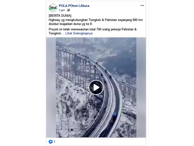 Jalan yang menghubungkan Tiongkok dengan Pakistan memang ada. Tapi, penampakannya tidak sesuai dengan yang diunggah halaman Facebook POLA-POtret Labura. Jawa Pos menemukan video jalan penghubung Tiongkok–Pakistan pernah diunggah kanal YouTube BBC pada 30 Agustus 2017.