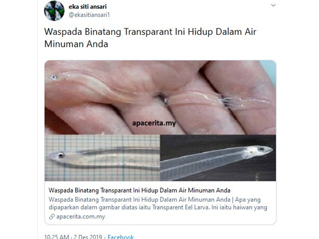Kabar tersebut beredar di Twitter dengan dilengkapi tautan blog dari Malaysia. ’’Waspada Binatang Transparant Ini Hidup Dalam Air Minuman Anda,’’ tulis akun Twitter Eka Siti Ansari (bit.ly/HewanTransparan) pada 2 Desember 2019 sembari menyertakan artikel dari blog apacerita.com.my.