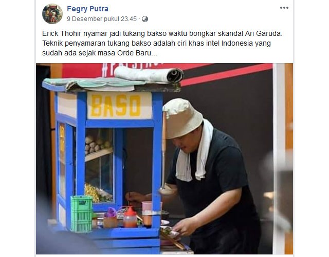 JawaPos.com - Silakan tersenyum kecut saat membaca informasi palsu yang disebar akun Facebook Fegry Putra (bit.ly/Nyamar) baru-baru ini. Akun tersebut mengunggah foto Erick Thohir sedang berjualan bakso. Kemudian, ia memberikan keterangan bahwa menteri BUMN itu sedang menyamar untuk membongkar kasus Ari Askhara.