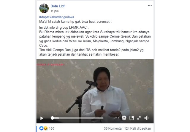 ”Ini dpt info dr group LPMK AAC. Bu Risma minta utk didoakan agar kota Surabaya tdk hancur krn adanya patahan lempeng yg melewati Sukolilo sampe Cerme Gresik Dan patahan yg garis kedua dari Waru ke Krian, Mojokerto, Jombang, Nganjuk sampe Cepu.” Begitu penggalan narasinya.