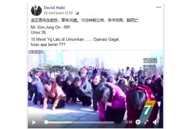 ”Mr Kim Jung On - RIP. Umur 36. 15 Menit Yg Lalu di Umumkan ...... Operasi Gagal. hoax apa bener ???,” bunyi keterangan yang diunggah akun Facebook David Habi pada 24 April lalu (bit.ly/KimMeninggal). Video dengan durasi 56 detik itu memang memperlihatkan ratusan orang menangis. Bahkan, ada yang sambil bersujud.