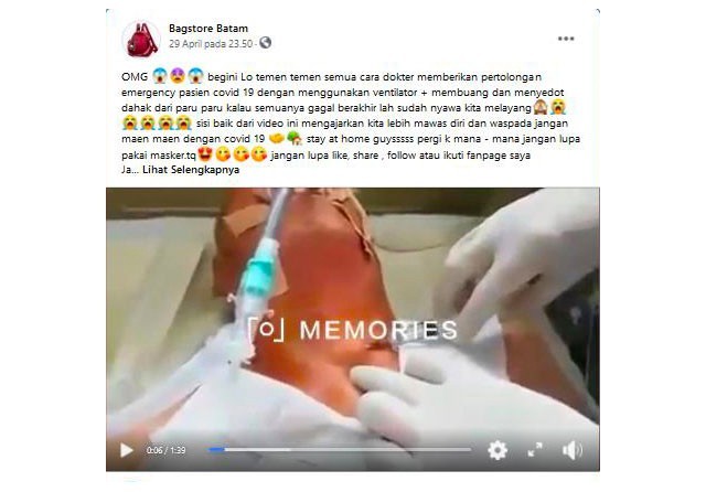 ”OMG begini Lo temen temen semua cara dokter memberikan pertolongan emergency pasien covid 19 dengan menggunakan ventilator + membuang dan menyedot dahak dari paru paru kalau semuanya gagal berakhir lah sudah nyawa kita melayang.” Begitu penggalan narasi yang ditulis pemilik akun Facebook Bagstore Batam (bit.ly/LubangiLeher).