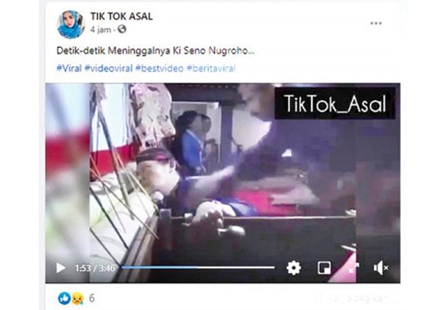 ’’Detik-detik Meninggalnya Ki Seno Nugroho... #Viral #videoviral #bestvideo #beritaviral.’’ Demikian keterangan yang dibagikan halaman Facebook TIK TOK ASL kemarin (5/11).