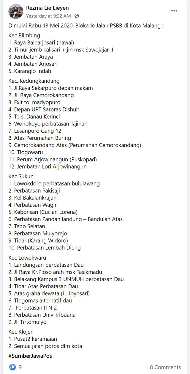 KABAR palsu tentang Kota Malang menyebar lewat aplikasi WhatsApp beberapa hari terakhir. Disebutkan bahwa siapa pun yang hendak memasuki Kota Malang harus dikarantina selama 14 hari. Informasi itu juga menyertakan imbauan untuk tidak masuk ke Kota Malang pada 15–25 Desember 2020.