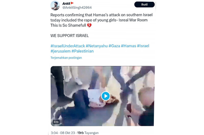 ’’Reports confirming that Hamas’s attack on southern Israel today included the rape of young girls- Isreal War Room This Is So Shamefull, WE SUPPORT ISRAEL,’’ tulis akun Twitter (X) @AnkitSingh42064.