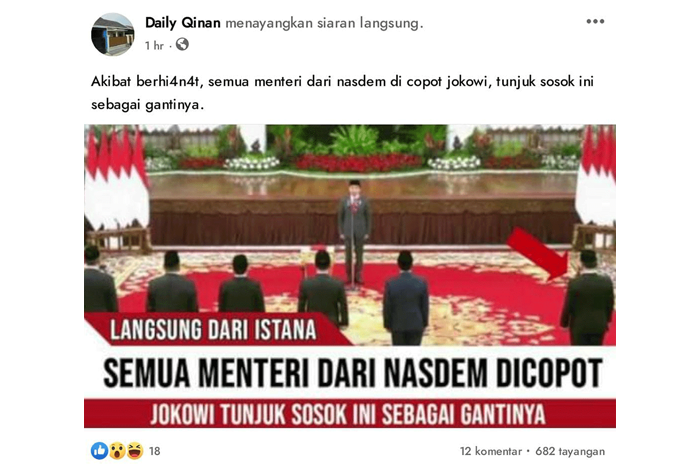 ’’Akibat berhi4n4t, semua menteri dari Nasdem di copot Jokowi, tunjuk sosok ini sebagai gantinya,’’ tulis akun Facebook Daily Qinan.