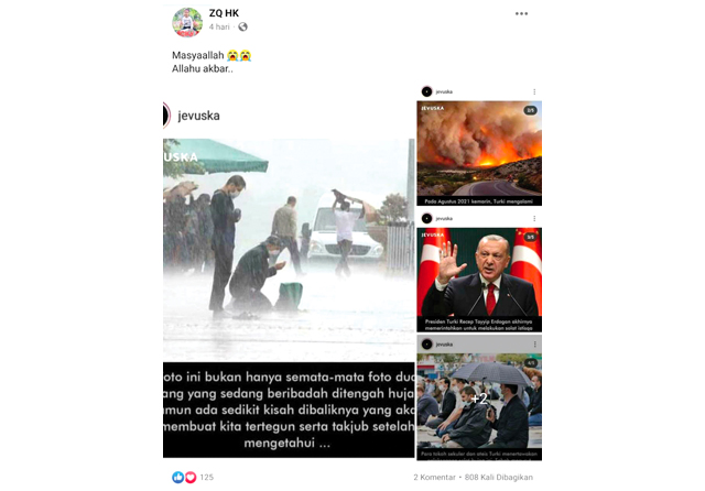”Alhamdulillah sudah tiba pasukan Turki di tanah Palestina. Takbir!” tulis akun Facebook Darlan Wahyudi pada 14 Mei 2021. Posting-an itu lantas dibagikan ulang akun Oky Soesanto yang membenarkan bahwa iring-iringan kendaraan tempur dalam video tersebut adalah pasukan Turki yang sudah sampai di Palestina (bit.ly/TurkiDatang).