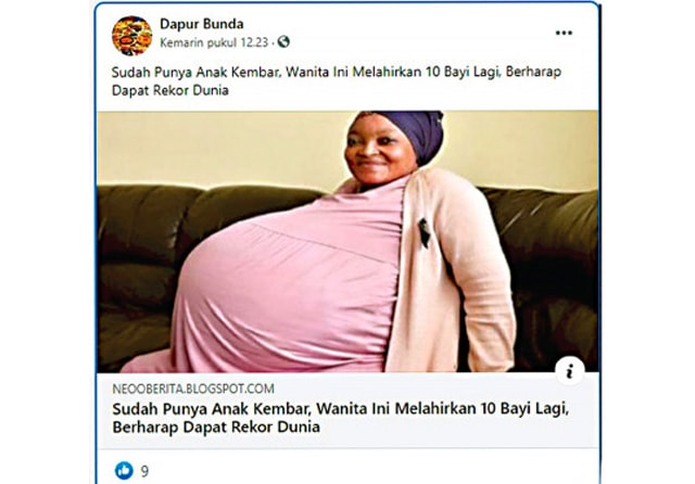 KABAR seorang ibu yang hamil 10 anak viral di media sosial. Di Indonesia, salah satu yang mengunggahnya adalah akun Facebook Dapur Bunda dengan menyertakan link sebuah blog. Dengan melahirkan 10 anak, ibu tersebut ingin memecahkan rekor dunia.