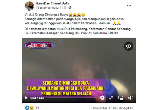 ”Viral,,,! Orang Dimangsa Buaya Semoga ditempatkan pada syurga-Nya dan diampunkan segala dosa, keluarga yg ditinggalkan selalu dalam ketabahan,,, Aamiiin,,,, Di Kawasan Jembatan Musi Dua Palembang, Kecamatan Gandus Seberang Ilir, Kecamatan Kertapati Seberang Ulu, Provinsi Sumatera Selatan,” tulis akun HarryDay Chanel UpTv pada 4 September 2021.