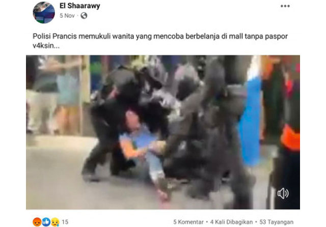’’Polisi Prancis memukuli wanita yang mencoba berbelanja di mall tanpa paspor v4ksin,’’ tulis akun Facebook El Shaarawy pada 5 November 2021. Netizen yang tak kroscek bisa jadi mudah terpengaruh. ’’Hanya karena vaksin diperlakukan sperti pelaku kejahatan dan kriminal,’’ bunyi komentar salah satu akun (bit.ly/KarenaVaksin).