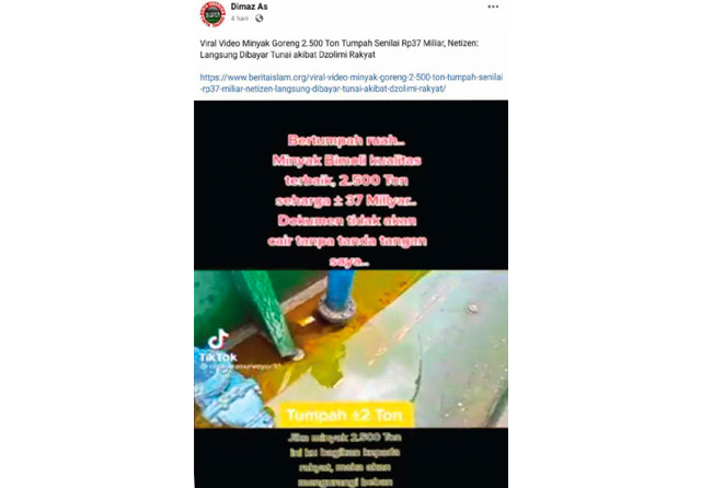 ”Viral Video Minyak Goreng 2.500 Ton Tumpah Senilai Rp37 Miliar, Netizen: Langsung Dibayar Tunai akibat Dzolimi Rakyat,’’ tulis akun Facebook Dimaz As pada 20 Maret 2022.