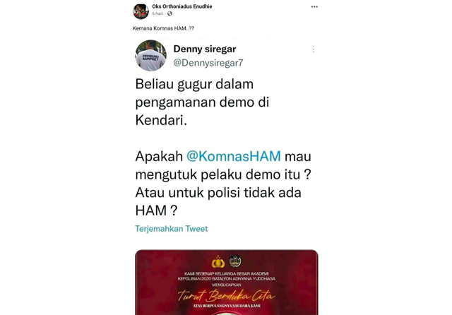 ”Beliau gugur dalam pengamanan Demo Kendari. Apakah @KomnasHAM mau mengutuk pelaku demo itu? Atau untuk polisi tidak ada HAM?” bunyi keterangannya. Capture tersebut menunjukkan nama Imam Agus Husein, alumnus Akpol berpangkat ipda (bit.ly/PamDemoKendari).