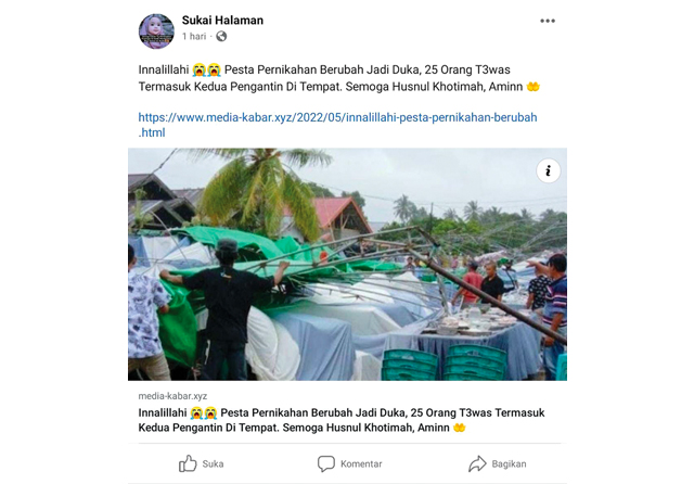 ”Innalillahi Pesta Pernikahan Berubah Jadi Duka, 25 Orang T3was Termasuk Kedua Pengantin Di Tempat. Semoga Husnul Khotimah, Aminn,” tulis akun Facebook Sukai Halaman pada 10 Mei 2022. Informasi tersebut juga menyertakan gambar terop yang porak-poranda. Nah, agar lebih tepercaya, akun itu menyertakan sebuah blog, media-kabar.xyz (bit.ly/PengantinTewas).