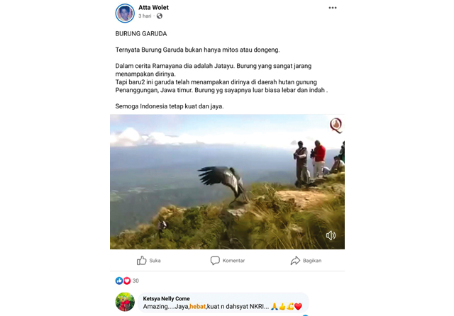 ’’Ternyata burung garuda bukan hanya mitos atau dongeng. Dalam cerita Ramayana dia adalah Jatayu. Burung yang sangat jarang menampakkan dirinya. Tapi baru2 ini garuda telah menampakkan diri di daerah hutan gunung Penanggungan, Jawa timur. Burung yg sayapnya luar biasa lebar dan indah. Semoga Indonesia tetap kuat dan jaya,’’ tulis akun Atta Wolet.
