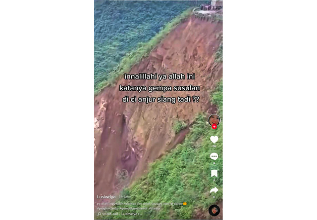 ”YA Allah. Lindungilah keluarga dan sanak saudara kami di Cianjur. #prayforcianjur #gempabumihariini #cianjur,” bunyi keterangan akun TikTok Lusiwdya. Video pendek itu beredar sejak 23 November hingga kemarin (24/11).