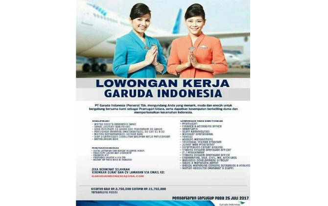 JawaPos.com- ’’PT Garuda Indonesia (Persero) Tbk mengundang anda yang menarik, muda, dan enerjik untuk bergabung bersama kami sebagai pramugari udara serta dapatkan kesempatan keliling dunia dan memperkenalkan keramahan Indonesia.’’ Begitu rayu copy iklan lowongan pekerjaan yang mengatasnamakan Garuda Indonesia.