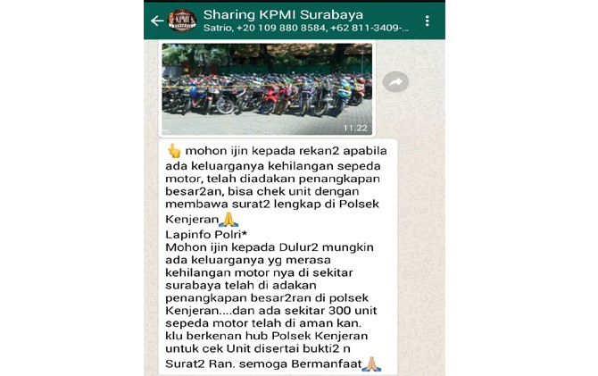 Isi pesan itu menginformasikan bahwa Polsek Kenjeran melakukan penangkapan besar-besaran. Dari penangkapan itu, polisi mengamankan 300 unit motor yang dianggap sebagai motor curian. Melalui sebaran singkat itu, pembuat pesan meminta siapa pun yang merasa kehilangan motor agar mengecek di Mapolsek Kenjeran. Masyarakat yang ingin mengecek diminta untuk membawa bukti dan surat kendaraan bermotor.