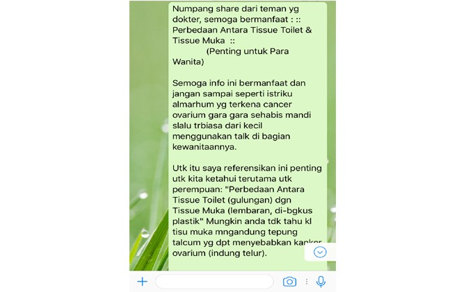 Contohnya broadcast tentang tisu toilet dan tisu muka yang bisa mengakibatkan kanker ovarium. Hoax tersebut sudah bertahan lebih dari lima tahun. Tapi, tetap saja masih ada yang menyebarkannya.
