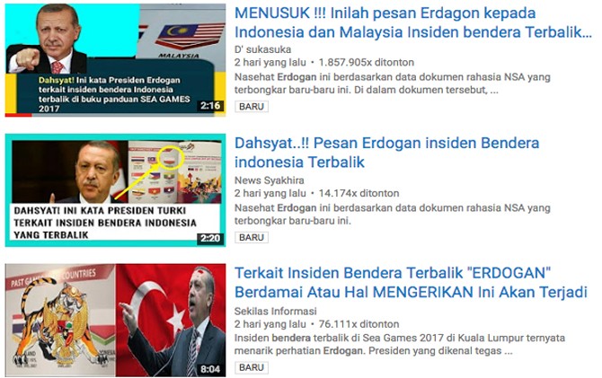 JawaPos.com- Polemik terbaliknya gambar bendera Indonesia dalam buku SEA Games 2017 di Kuala Lumpur terus menjadi bahan penyebaran hoax. Kali ini muncul kabar bahwa Presiden Turki Recep Tayyip Erdogan ikut berkomentar terkait hal tersebut.