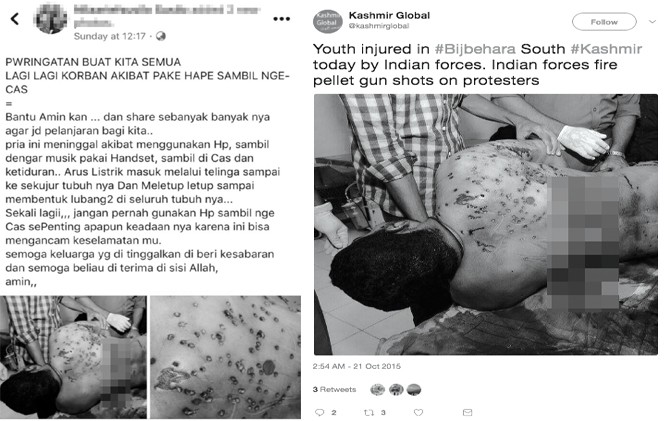BANDINGKAN: Foto kiri, salah satu akun yang mengunggah foto pemuda dengan punggung penuh luka. Foto yang sama diunggah situs berita Khasmir Global pada 21 Oktober 2015 dengan keterangan korban luka akibat tembakan pellet gun.