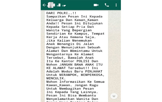 ”Jika Kalian Menemukan Anak Menangis Di Jalan Dengan Menunjukkan Sebuah Alamat Dan Memintamu Untuk Mengantarnya Ke Alamat Tersebut, Bawalah Anak Itu Ke Kantor POLISI Dan Mohon JANGAN BAWA ANAK ITU KE ALAMAT Tersebut!! Ini Adalah Modus Baru PENJAHAT Untuk MERAMPOK, MEMPERKOSA, MENCULIK,” bunyi sebagian pesan dalam hoax tersebut. Khas pesan abal-abal dengan banyak kesalahan ketik dan penggunaan huruf kapital yang lebay.