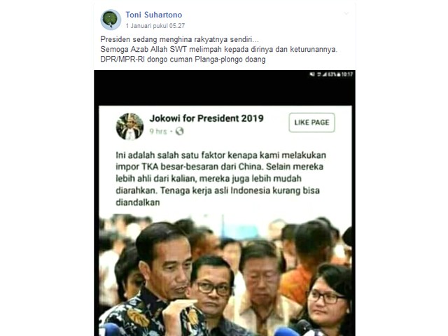 Posting-an tersebut diunggah kembali oleh akun Toni Suhartono (bit.ly/ImporTKA) di grup Facebook Suara Rakyat Indonesia. Oleh akun itu, potongan tangkapan layar tersebut ditambahi tulisan, ’’Presiden sedang menghina rakyatnya sendiri. Semoga Azab Allah SWT melimpah kepada dirinya dan keturunannya. DPR/MPR-RI dongo cuman Planga-plongo doang."