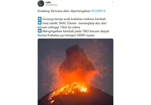 ”Breaking: Bencana alam dipertengahan #COVID19 Segitiga ganda mengarah ke kanan. Gunung berapi anak krakatau meletus kembali. Segitiga ganda mengarah ke kanan. Imej satelit, VAAC Darwin menangkap abu dari letusan setinggi 15 km ke udara.” Begitulah penggalan narasi yang diunggah pada 12 April 2020 (bit.ly/DitengahCovid).