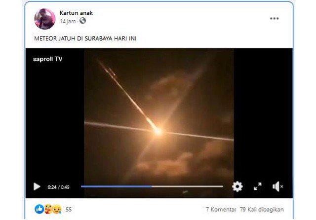 Video benda bersinar jatuh dari langit itu bukan meteor yang tampak di atas Sidosermo, Surabaya. Melainkan serpihan roket komersial milik Tiongkok yang meledak dan terlihat di Pulau Guam, Pasifik Barat.