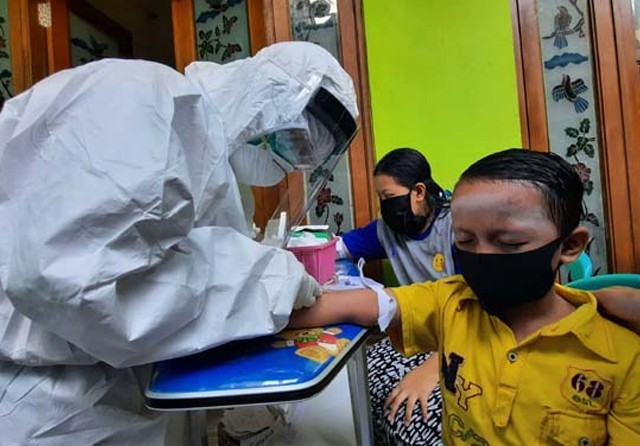 CEGAH MELUAS: Petugas Puskesmas Rangkah melakukan rapid test kepada anak yang tinggal di kawasan Jalan Bogen I, Sabtu (16/5). (Galih Adi/Jawa Pos)