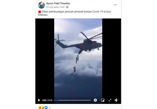 ”Video pembuangan jenazah-jenazah korban Covid-19 di laut Meksiko,” begitu keterangan yang ditulis akun Facebook Aaron Fidel Timothy pada 25 Juni 2020. Video berdurasi 18 detik itu tampak direkam melalui pesawat yang sejajar dengan helikopter. Setelah merekam orang-orang itu keluar dari lambung helikopter, kamera langsung melihat ke bawah (bit.ly/PembuanganJenazah).