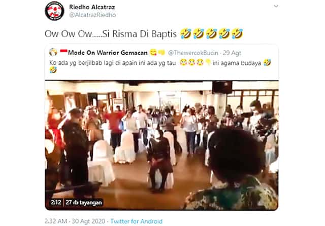”Oalaaah, Jenk RISMA ngapain tu.....Di Baptis yak,” komentar dari akun Facebook Panglima Muslimah sembari membagikan postingan akun Twitter @kharimakharima1 pada 30 Agustus 2020 (bit.ly/RismaDibaptis).
