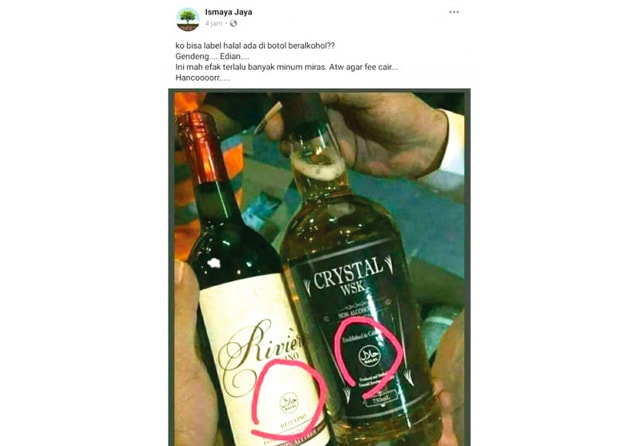 Contohnya, yang dibagikan ulang akun Facebook Ismaya Jaya kemarin (2/3). ”Kok bisa label halal ada di botol beralkohol?? Gendeng. Edian. Ini mah efak terlalu banyak minum miras. Atw agar fee cair. Hancoooorr,” tulis akun tersebut kemarin (bit.do/MirasHalal).