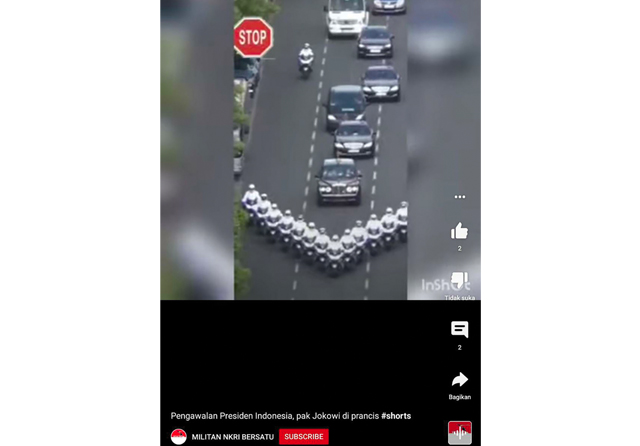 ”Pengawalan Presiden Indonesia, pak Jokowi di prancis #shorts.” Begitu keterangan akun YouTube MILITAN NKRI BERSATU. Video berdurasi 8 detik itu memperlihatkan formasi pengawalan membentuk seperti huruf V. Setidaknya ada tujuh mobil dalam rangkaian tersebut (bit.ly/KawalJokowiPrancis).