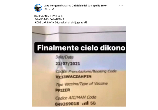 ”DARI VAKSIN COVID ke-3 ORANG MENDAPATKAN A KODE JARINGAN 5G, apakah di sini juga ada??,’’ tulis akun Facebook Dave Morgan II pada 12 Februari 2022 (bit.ly/DapatKode5G).