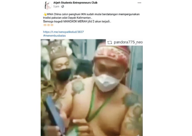’’WNA China calon penghuni IKN sudah mulai berdatangan mempergunakan tradisi pakaian adat Dayak Kalimantan.. Semoga tragedi MANGKOK MERAH jilid 2 akan terjadi.’’ Demikian keterangan akun Facebook Atjeh Student Entrepreneurs Club di sebuah grup kemarin (5/5).