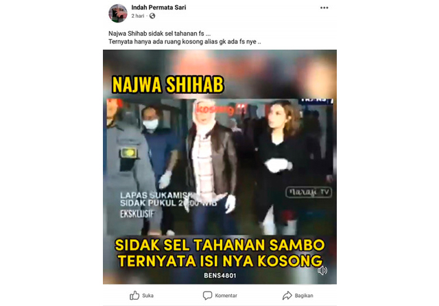 Narasi yang disampaikan dengan video yang dicantumkan itu sejak awal memang penuh kejanggalan. Bila melihat dengan saksama pada video tersebut, berulang-ulang ditampilkan cuplikan gambar dengan tulisan yang menyebutkan bahwa Najwa tidak sedang sidak ke sel tahanan Ferdy Sambo. Informasi itu tentu bertentangan dengan kalimat simpulan yang diunggah akun Facebook Indah Permata Sari itu. Tapi, pada kolom komentar, ada saja akun lain yang terkesan percaya bahwa sel Sambo kosong.