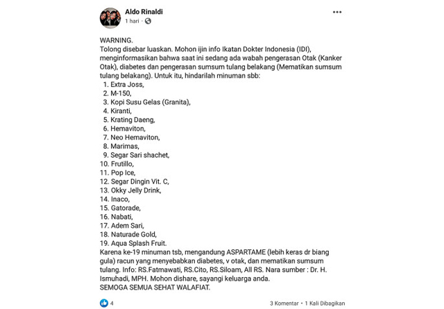 Di Facebook, akun Aldo Rinaldi turut membagikan pesan tersebut. Tertulis 19 jenis minuman yang harus dihindari untuk mencegah terjadinya pengerasan otak. Agar lebih meyakinkan, informasi itu turut menyertakan nama dokter dari beberapa rumah sakit.