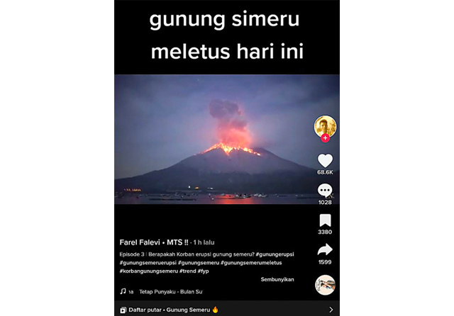HOAX soal awan panas guguran (APG) Gunung Semeru makin bermunculan. Informasi itu menyebar dengan menggunakan video pendek di berbagai platform medsos. Salah satunya melalui akun TikTok Farel Fahlevi beberapa hari lalu.