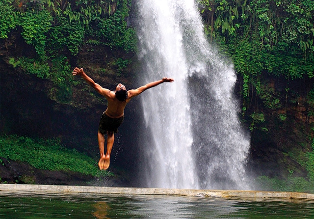 SEGAR: Seorang pengunjung nyebur ke dalam Air Terjun Dewi Rengganis. Pengelola objek tersebut menyediakan kolam khusus mengingat kawasan air terjun itu cukup berbahaya. (Zainal Airifin/Jawa Pos Radar Bromo)