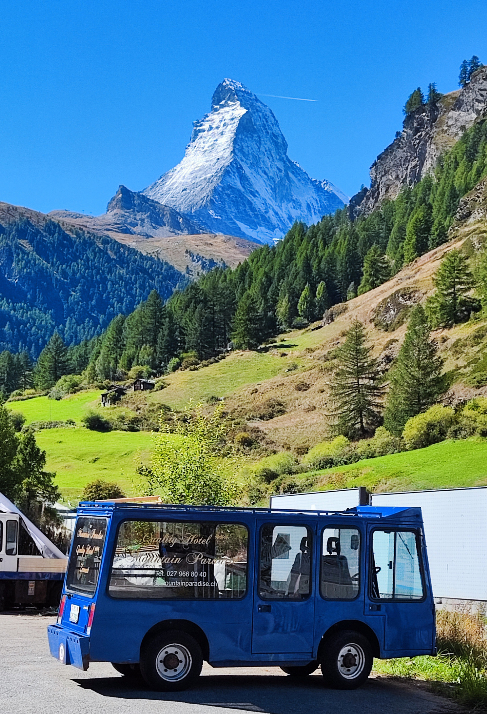 Mobil listrik dan Gunung Matterhorn adalah ikon dari Zermatt. Foto: Dinarsa Kurniawan/JawaPos.com