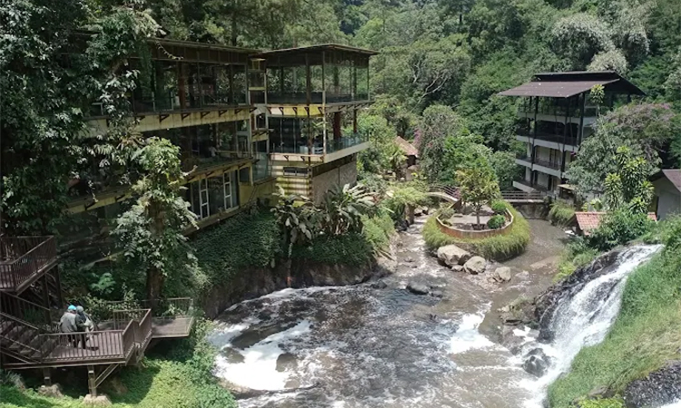 Meski lebih dikenal sebagai penginapan, Maribaya Resort juga bisa jadi pilihan untuk sekadar liburan singkat. Salah satu daya tarik utamanya adalah kafe dengan view langsung ke curug atau air terjun kecil yang cantik.