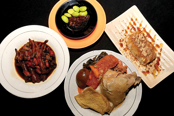 Gudeg manggar dilengkapi dengan ketupat, daging ayam, bubuk kedelai, dan telur ayam.