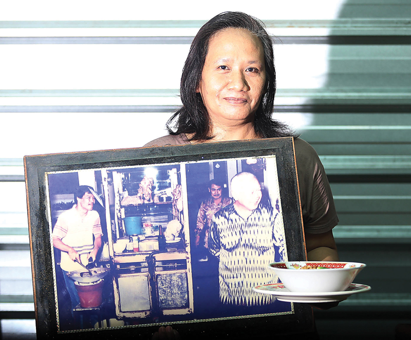 JAGA TRADISI: Mugi Lestari memamerkan foto Soeharto saat berkunjung ke warung Bakmi Jawa Harjo Geno. (ROBERTUS RISKI/JAWA POS)