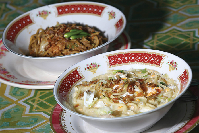 NGANGENI: Mi godok (bawah) dan mi goreng andalan Bakmi Jawa Harjo Geno nikmat disantap selagi hangat. (ROBERTUS RISKI/JAWA POS)