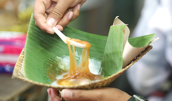 BERVARIASI: Jenang Gesti menyediakan berbagai jenang. Dari kiri, sumsum cokelat, mutiara, dan sumsum putih. (AHMAD KHUSAINI/JAWA POS)