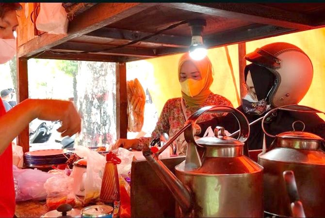 BORONG: Istri Bupati Blora Ainia Shalichah (pakai helm) saat borong makanan pedagang angkringan di depan SMP 6 Blora kemarin. (PKK BLORA FOR RADAR KUDUS)