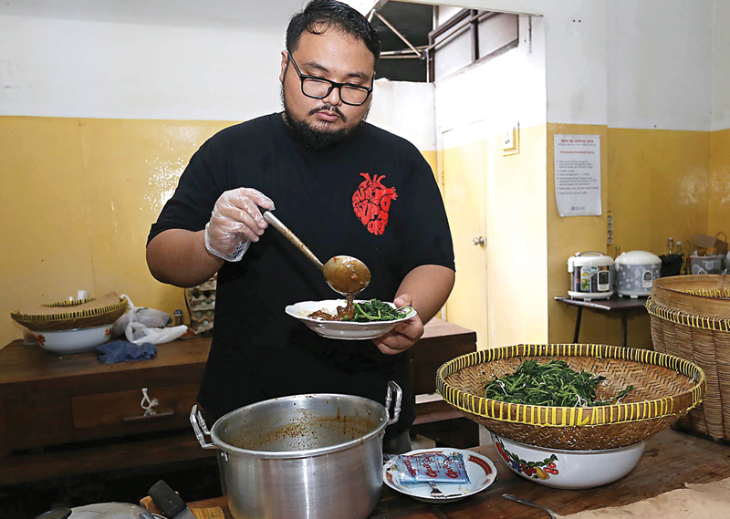 Nasi pecel disiram bumbu kacang sebelum disajikan kepada pelanggan. (ROBERTUS RISKY/JAWA POS)