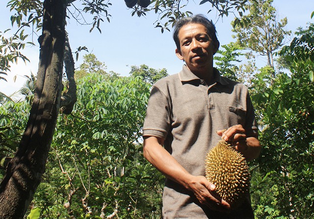 MENGGIURKAN: Winanto, anak keempat penemu durian ripto, menunjukkan durian dari pohon di depan rumahnya. (HENNY SURYA AKBAR PURNA PUTRA/RADAR TRENGGALEK)